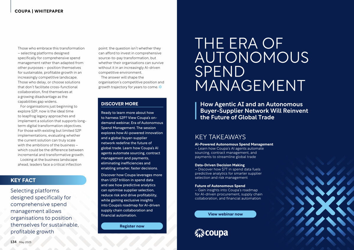 Ready to learn more about how to harness S2P? View Coupa’ s ondemand webinar, Era of Autonomous Spend Management. The session explores how AI-powered innovation and a global buyer-supplier network redefine the future of global trade. Learn how Coupa’ s AI agents automate sourcing, contract management and payments, eliminating inefficiencies and enabling smarter, faster decisions.