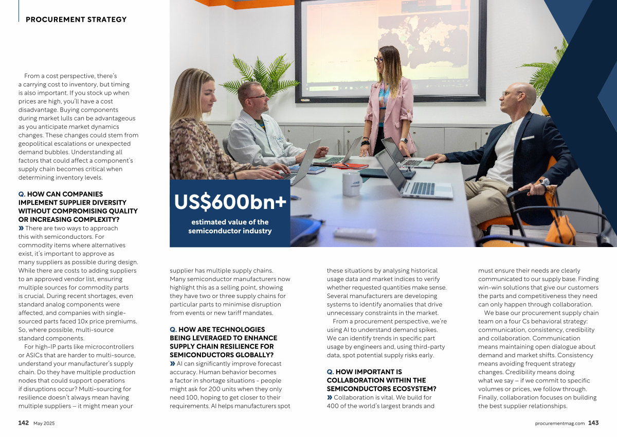 » There are two ways to approach this with semiconductors. For commodity items where alternatives exist, it’ s important to approve as many suppliers as possible during design. While there are costs to adding suppliers to an approved vendor list, ensuring multiple sources for commodity parts is crucial. During recent shortages, even standard analog components were affected, and companies with singlesourced parts faced 10x price premiums. So, where possible, multi-source standard components.