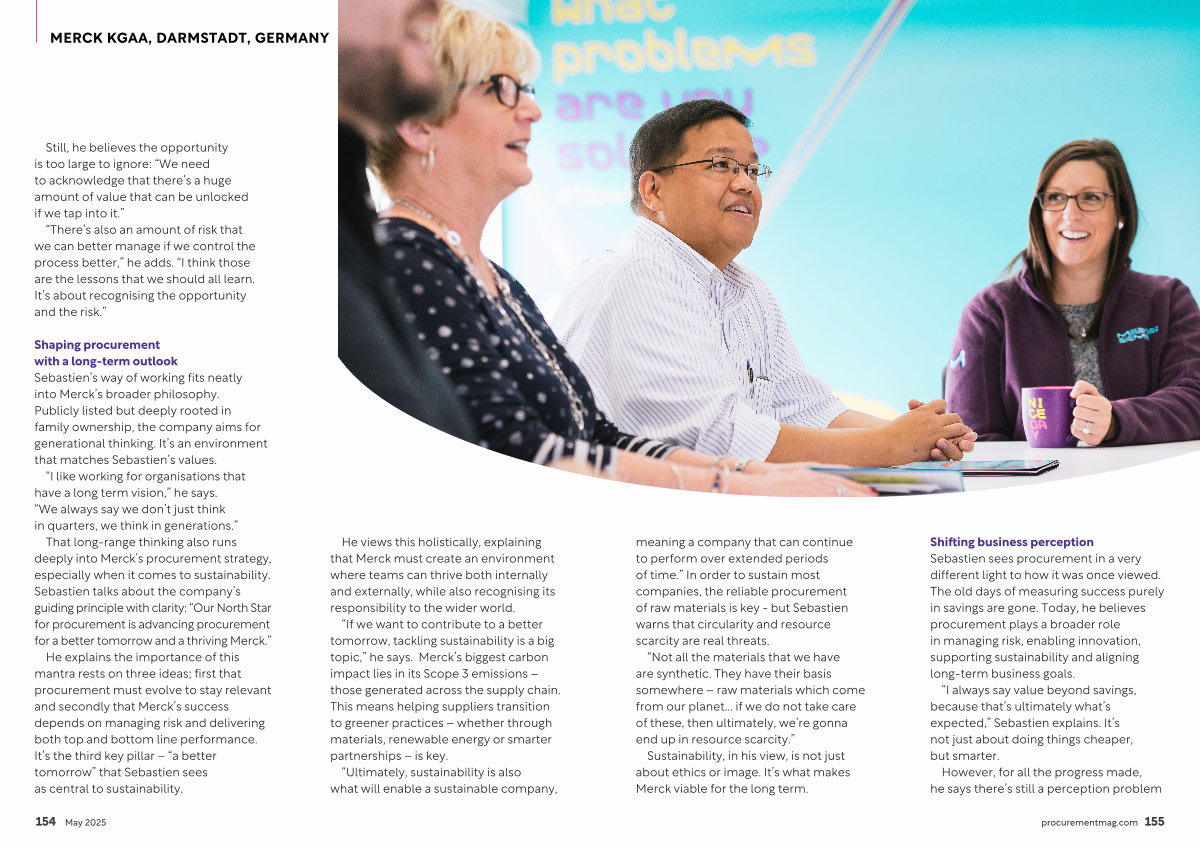 Shifting business perception Sebastien sees procurement in a very different light to how it was once viewed. The old days of measuring success purely in savings are gone. Today, he believes procurement plays a broader role in managing risk, enabling innovation, supporting sustainability and aligning long-term business goals.
