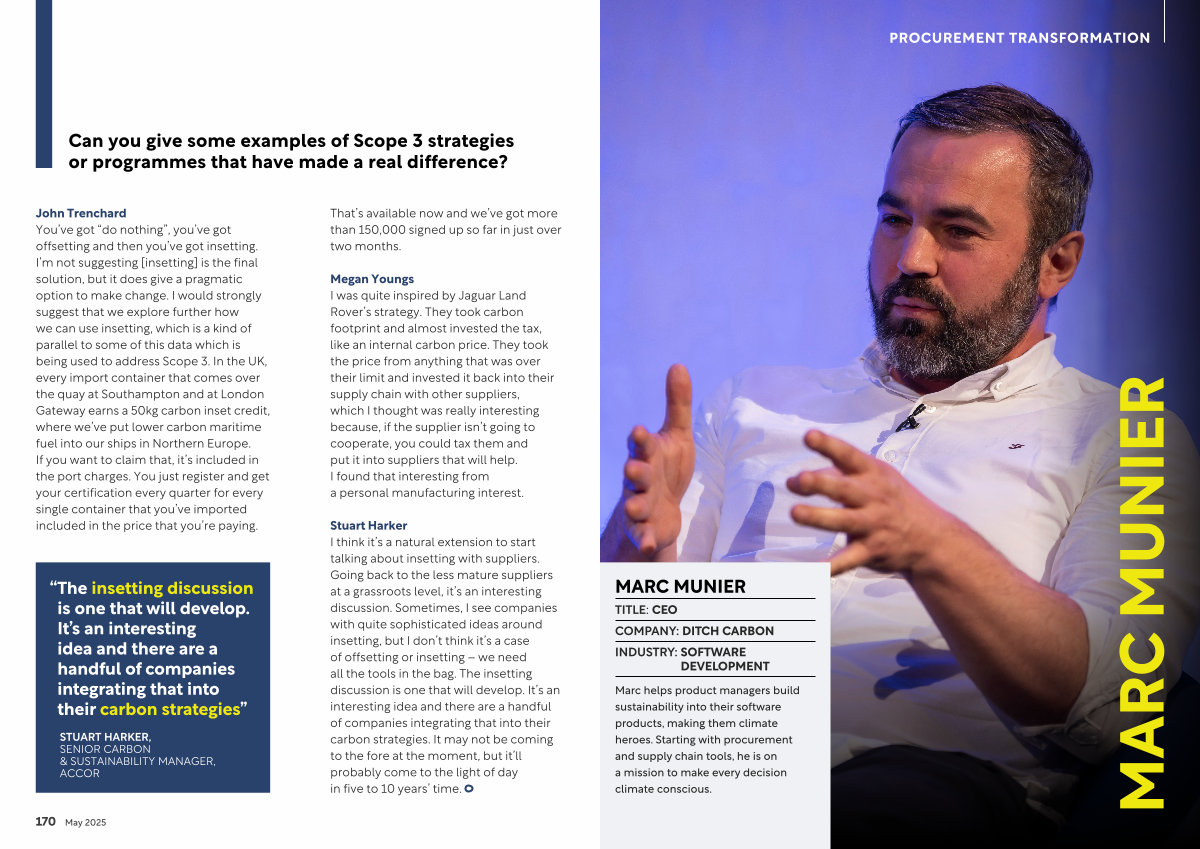 Stuart Harker I think it’ s a natural extension to start talking about insetting with suppliers. Going back to the less mature suppliers at a grassroots level, it’ s an interesting discussion. Sometimes, I see companies with quite sophisticated ideas around insetting, but I don’ t think it’ s a case of offsetting or insetting – we need all the tools in the bag. The insetting discussion is one that will develop. It’ s an interesting idea and there are a handful of companies integrating that into their carbon strategies. It may not be coming to the fore at the moment, but it’ ll probably come to the light of day in five to 10 years’ time.
