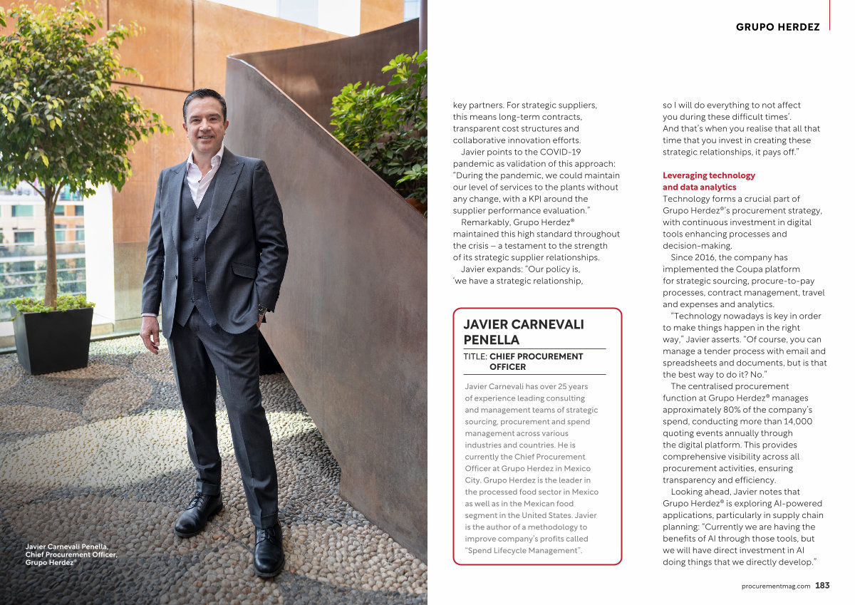 Javier Carnevali has over 25 years of experience leading consulting and management teams of strategic sourcing, procurement and spend management across various industries and countries. He is currently the Chief Procurement Officer at Grupo Herdez in Mexico City. Grupo Herdez is the leader in the processed food sector in Mexico as well as in the Mexican food segment in the United States. Javier is the author of a methodology to improve company’ s profits called“ Spend Lifecycle Management”. so I will do everything to not affect you during these difficult times’. And that’ s when you realise that all that time that you invest in creating these strategic relationships, it pays off.”