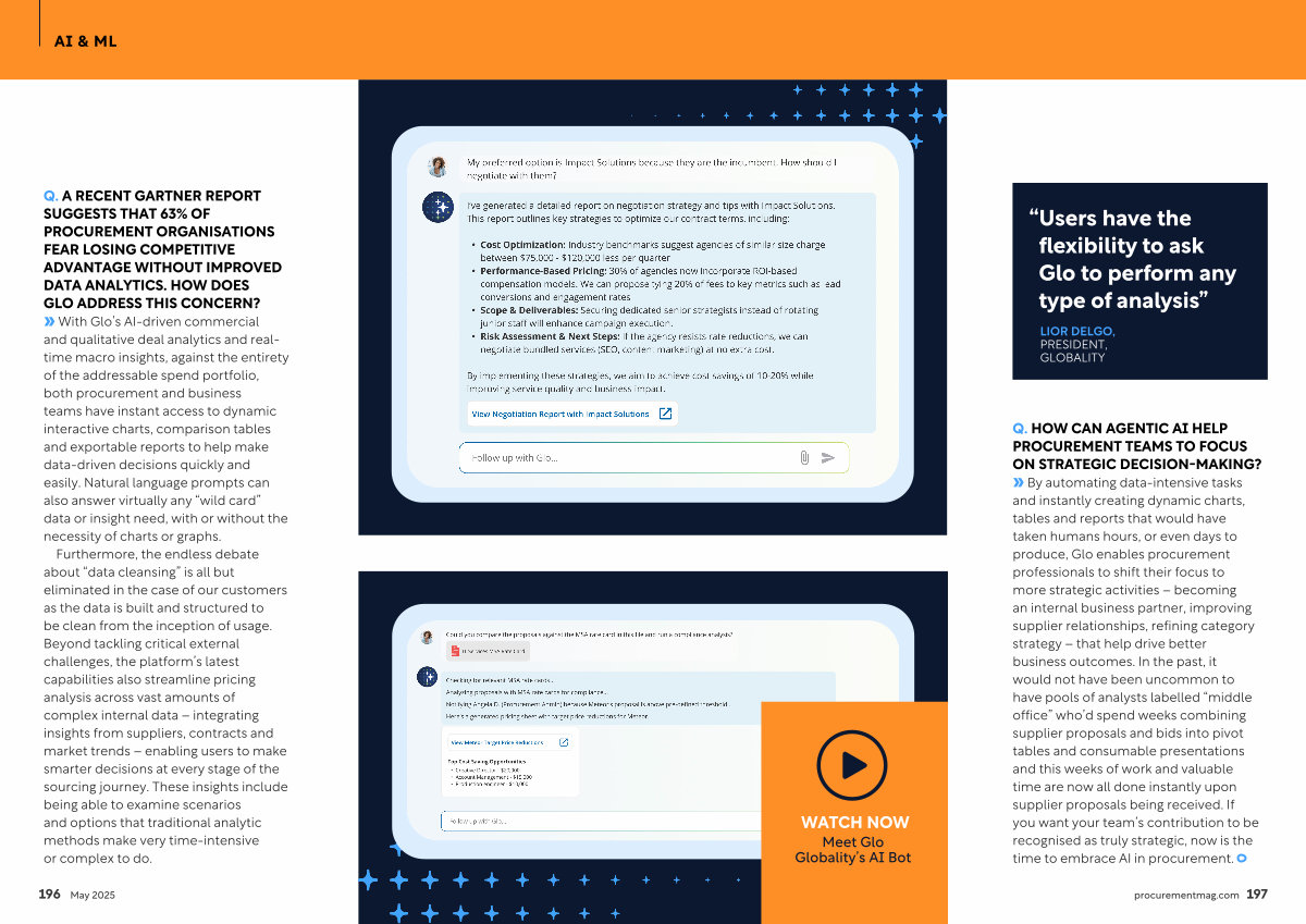 » By automating data-intensive tasks and instantly creating dynamic charts, tables and reports that would have taken humans hours, or even days to produce, Glo enables procurement professionals to shift their focus to more strategic activities – becoming an internal business partner, improving supplier relationships, refining category strategy – that help drive better business outcomes. In the past, it would not have been uncommon to have pools of analysts labelled“ middle office” who’ d spend weeks combining supplier proposals and bids into pivot tables and consumable presentations and this weeks of work and valuable time are now all done instantly upon supplier proposals being received. If you want your team’ s contribution to be recognised as truly strategic, now is the time to embrace AI in procurement.