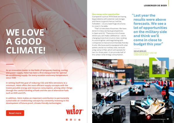 “ That ’ s a new area of business . We have done it in Asia , we have good partners in Spain and US . “ There are a lot of areas where you can make a difference – we ’ re changing more from truck to train , looking to source lighter , and negotiating with companies to have environmentally friendly trucks . We have events equipped with solar panels , and at our military sites , we built a big camp in Mali , which will operate for two-to-three years . It can provide half of the camp ’ s total energy consumption .