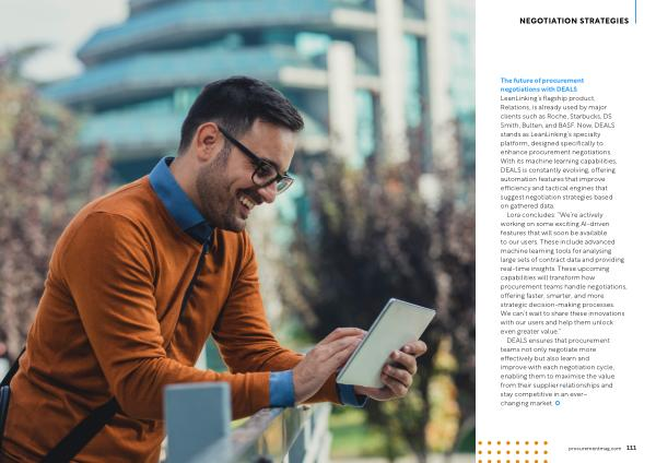 The future of procurement negotiations with DEALS LeanLinking ’ s flagship product , Relations , is already used by major clients such as Roche , Starbucks , DS Smith , Bulten , and BASF . Now , DEALS stands as LeanLinking ’ s specialty platform , designed specifically to enhance procurement negotiations . With its machine learning capabilities , DEALS is constantly evolving , offering automation features that improve efficiency and tactical engines that suggest negotiation strategies based on gathered data .