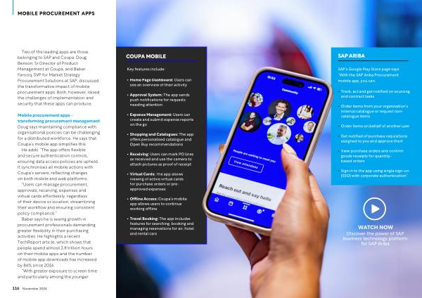Two of the leading apps are those belonging to SAP and Coupa . Doug Benson , Sr Director of Product Management at Coupa , and Baber Farooq , SVP for Market Strategy Procurement Solutions at SAP , discussed the transformative impact of mobile procurement apps . Both , however , raised the challenges of implementation and security that these apps can produce .