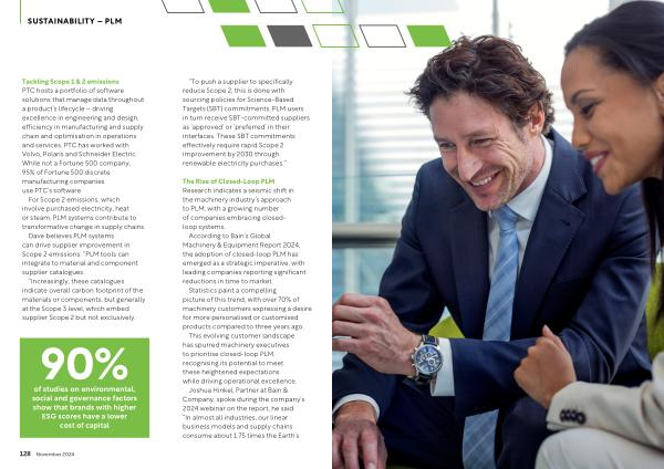 Tackling Scope 1 & 2 emissions PTC hosts a portfolio of software solutions that manage data throughout a product ’ s lifecycle – driving excellence in engineering and design , efficiency in manufacturing and supply chain and optimisation in operations and services . PTC has worked with Volvo , Polaris and Schneider Electric . While not a Fortune 500 company , 95 % of Fortune 500 discrete manufacturing companies use PTC ’ s software .