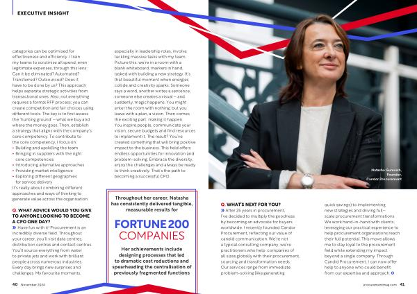 » Have fun with it ! Procurement is an incredibly diverse field . Throughout your career , you ’ ll visit data centres , distribution centres and contact centres . You ’ ll source everything from water to private jets and work with brilliant people across numerous industries . Every day brings new surprises and challenges . My favourite moments , especially in leadership roles , involve tackling massive tasks with my team . Picture this : we ’ re in a room with a blank whiteboard , markers in hand , tasked with building a new strategy . It ’ s that beautiful moment when energies collide and creativity sparks . Someone says a word , another writes a sentence , someone else creates a visual – and suddenly , magic happens . You might enter the room with nothing , but you leave with a plan , a vision . Then comes the exciting part : making it happen . You inspire people , communicate your vision , secure budgets and find resources to implement it . The result ? You ’ ve created something that will bring positive impact to the business . This field offers endless opportunities for innovation and problem-solving . Embrace the diversity , enjoy the challenges and always be ready to think creatively . That ’ s the path to becoming a successful CPO .