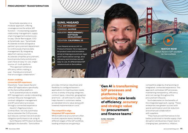 Sunil Masand , SVP Product at Aavenir , highlights the benefits : “ ServiceNow provides immense robustness and flexibility to configure Aavenir ’ s applications to meet business needs across a variety of buying categories , contract types , industries , geographies and more – all with low / no code . This helps Aavenir ’ s customers realise accelerated time to value along with lowered implementation costs .”