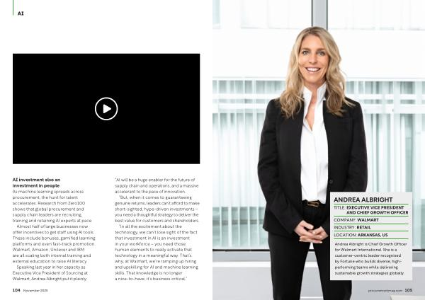 AI AI investment also an investment in people As machine learning spreads across procurement, the hunt for talent accelerates. Research from Zero100 shows that global procurement and supply chain leaders are recruiting, training and retaining AI experts at pace. Almost half of large businesses now offer incentives to get staff using AI tools. These include bonuses, gamified learning platforms and even fast-track promotion. Walmart, Amazon, Unilever and IBM are all scaling both internal training and external education to raise AI literacy.
