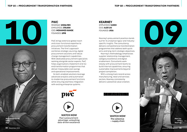 Kearney’ s procurement practice stands out for its analytical rigour and industryspecific insights. The consultancy delivers comprehensive transformation programmes that address both quick wins and long-term strategic objectives.