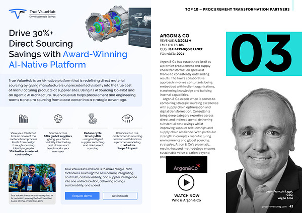 Argon & Co has established itself as a premier procurement and supply chain transformation specialist thanks to consistently outstanding results. The firm’ s collaborative approach involves consultants being embedded within client organisations, transferring knowledge and building internal capabilities.