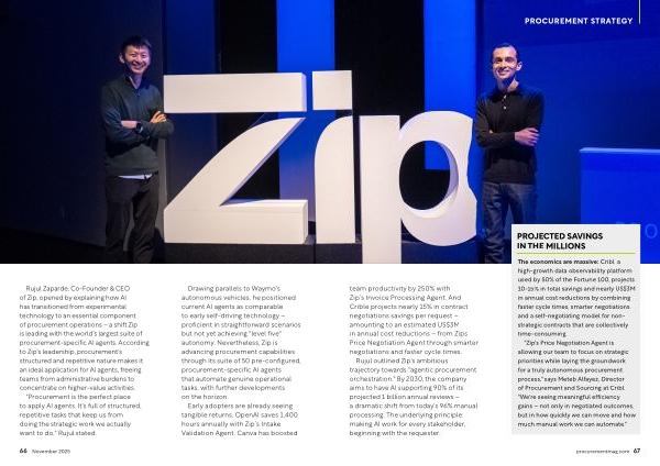 PROJECTED SAVINGS IN THE MILLIONS team productivity by 250 % with Zip’ s Invoice Processing Agent. And Crible projects nearly 15 % in contract negotiations savings per request – amounting to an estimated US $ 3M in annual cost reductions – from Zips Price Negotiation Agent through smarter negotiations and faster cycle times.