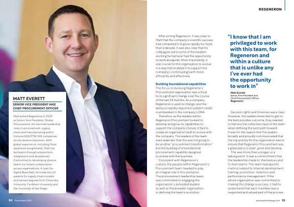 Building foundational capabilities This focus on evolving Regeneron’ s Procurement organisation was critical to its significant change over the course of the last 24 months. As a company, Regeneron is used to change, and the ability to rapidly respond to patient needs is embedded in the company’ s DNA.