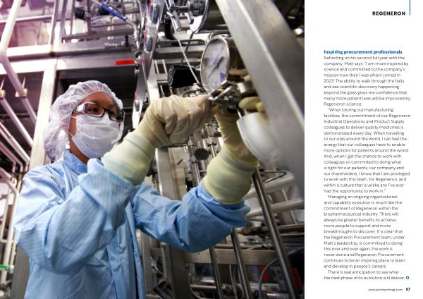 Inspiring procurement professionals Reflecting on his second full year with the company, Matt says:“ I am more inspired by science and committed to the company’ s mission now than I was when I joined in 2023. The ability to walk through the halls and see scientific discovery happening beyond the glass gives me confidence that many more patient lives will be improved by Regeneron science.