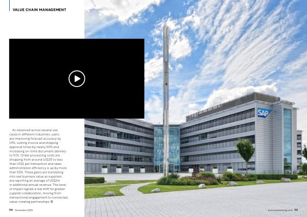 VALUE CHAIN MANAGEMENT As observed across several use cases in different industries, users are improving forecast accuracy by 19 %, cutting invoice and shipping approval times by nearly 50 % and increasing on-time document delivery to 91 %. Order processing costs are dropping from around US $ 30 to less than US $ 1 per transaction and sales administration efficiency is up by more than 50 %. These gains are translating into real business value as suppliers are reporting an average of US $ 2m in additional annual revenue. This level of impact signals a real shift for greater supplier collaboration, moving from transactional engagement to connected, value-creating partnerships.