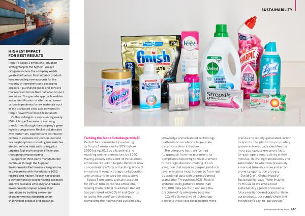 The company has transformed its approach from measurement for compliance reporting to measurement for strategic decision-making. It’ s an evolution that requires deeper, productlevel emissions insights derived from real operational data with unprecedented granularity. Throughout 2023, Reckitt systematically gathered more than 300,000 data points to enhance the precision of its emissions baseline.
