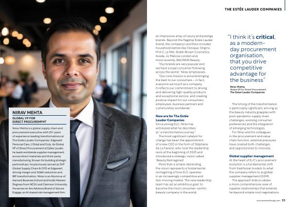 Nirav Mehta is a global supply chain and procurement executive with 25 + years of experience leading transformations at The Estée Lauder Companies, Edgewell Personal Care, L’ Oréal and Coty. As Global VP of Direct Procurement at Estée Lauder, he leads worldwide supplier management across direct materials and third-party manufacturing. Known for building strategic partnerships, he previously served as SVP Global Supply Chain & CPO at Edgewell, driving margin and SG & A reduction and IBP transformation. Nirav is an Alumnus of Harvard Business School and holds Masters Degrees from NCSU and Clemson University. He serves on the Advisory Board of Secure Engage, an AI-based risk management firm.