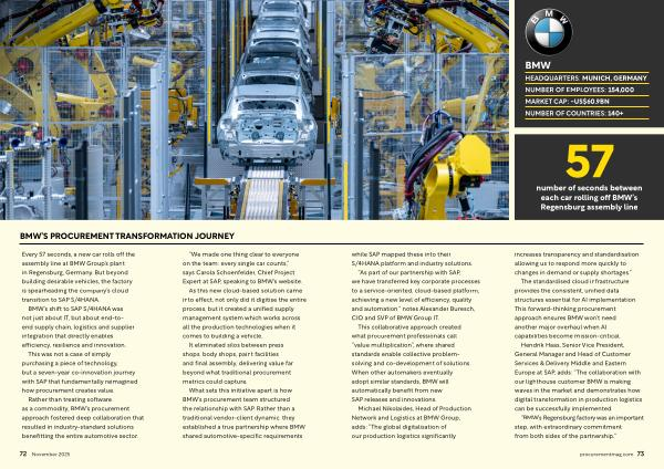 This collaborative approach created what procurement professionals call“ value multiplication”, where shared standards enable collective problemsolving and co-development of solutions. When other automakers eventually adopt similar standards, BMW will automatically benefit from new SAP releases and innovations.