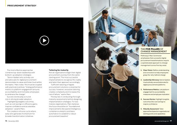 “ Senior leaders who actively use and advocate for digital procurement demonstrate its value and foster trust within the teams,” Marc notes. This must be coupled with practical incentives:“ linking performance metrics to platform engagement ensures accountability and motivates employees to embrace the change”.
