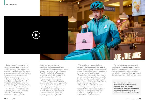 Called Project Penne, it aimed to embed policy and governance into the S2P platform. Using“ adopt best practice, adapt Deliveroo,” the team’ s processes were simplified, compliance became embedded and manual checks were reduced.