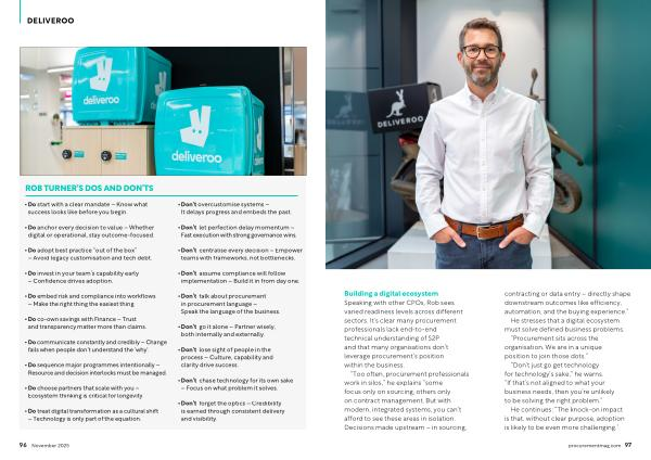 Building a digital ecosystem Speaking with other CPOs, Rob sees varied readiness levels across different sectors. It’ s clear many procurement professionals lack end-to-end technical understanding of S2P and that many organisations don’ t leverage procurement’ s position within the business.