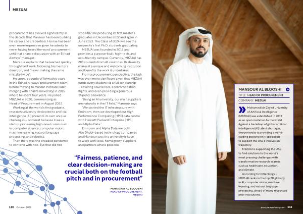 He spent a couple of formative years in the Etihad Airways ’ procurement team before moving to Masdar Institute ( later merging with Khalifa University ) in 2015 where he spent four years . He joined MBZUAI in 2020 , commencing as Head of Procurement in August 2022 .