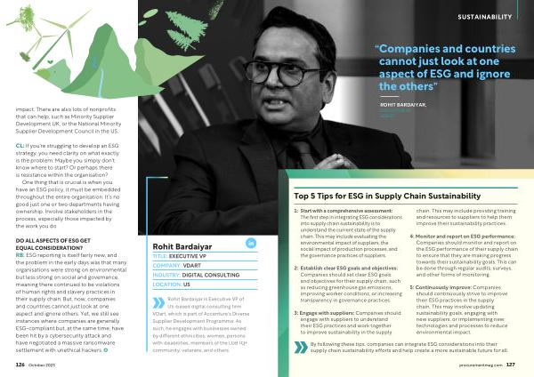 DO ALL ASPECTS OF ESG GET EQUAL CONSIDERATION ? RB : ESG reporting is itself fairly new , and the problem in the early days was that many organisations were strong on environmental but less strong on social and governance , meaning there continued to be violations of human rights and slavery practices in their supply chain . But , now , companies and countries cannot just look at one aspect and ignore others . Yet , we still see instances where companies are generally ESG-compliant but , at the same time , have been hit by a cybersecurity attack and have negotiated a massive ransomware settlement with unethical hackers .