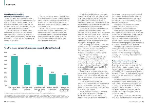 Source : Convera – July 6-7 2023 . Displaying responses from 95 businesses across Europe , APAC and NAM . Respondents included industries such as financial services , manufacturing , and respondent job titles included FDs , CFOs , and MDs . Question : “ Thinking about the next 6-12 months , what issue ( s ) concerns you most today ?”. ‘ Other ’ concerns not displayed included Digital transformation / automation .
