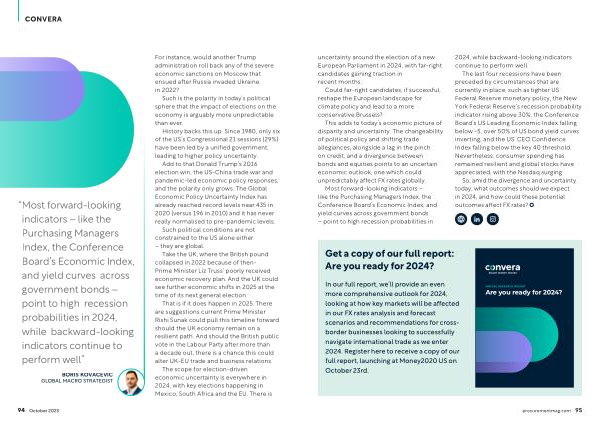 In our full report , we ’ ll provide an even more comprehensive outlook for 2024 , looking at how key markets will be affected in our FX rates analysis and forecast scenarios and recommendations for crossborder businesses looking to successfully navigate international trade as we enter 2024 . Register here to receive a copy of our full report , launching at Money2020 US on October 23rd .