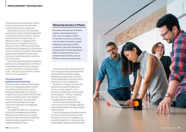Successful procurement automation requires a phased approach to KPIs. Focus on adoption metrics for the first 3-6 months: transaction volumes within the system, supplier enablement rates and workflow compliance. Only after establishing strong adoption should organisations shift to operational performance indicators like cycle time, cost per PO and no-touch transaction rates.