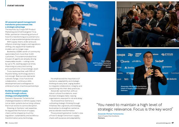 AI-powered spend management transforms procurement into a strategic advantage The keynote, by Coupa SVP Product Marketing and Chief Evangelist Tricia Miller, painted an interesting picture of how AI is transforming procurement at a time of unprecedented global disruption.