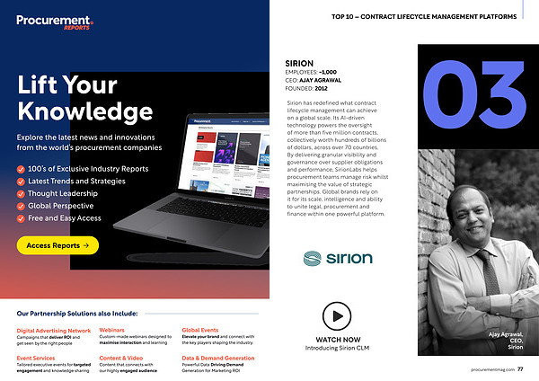 Sirion has redefined what contract lifecycle management can achieve on a global scale. Its AI-driven technology powers the oversight of more than five million contracts, collectively worth hundreds of billions of dollars, across over 70 countries. By delivering granular visibility and governance over supplier obligations and performance, SirionLabs helps procurement teams manage risk whilst maximising the value of strategic partnerships. Global brands rely on it for its scale, intelligence and ability to unite legal, procurement and finance within one powerful platform.