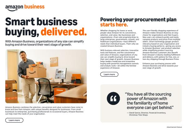 Enhance your purchasing process with Amazon Business and drive towards your next stage of growth.“ You have all the sourcing power of Amazon with the familiarity of home everyone can get behind.”