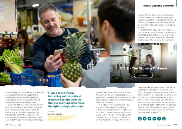 In the 18 months to come , von Pein hopes to further exploit the many efficiencies of digitalisation , and how it can impact Dole ’ s sustainability drive , a pledge under the Dole Promise banner . “ Sustainable procurement is a priority at this moment ,” she says . “ We want to need to make the right strategic decisions . Leading back to indirect procurement , I think the biggest challenge is poor quality of information , as I have little visibility today on how much and where we are buying , and for what cost . It ' s still a lot of manual work but , two years down the line , we will be in a much better position to increasingly benefit from the elusive opportunities of procurement-led , business performanceimprovement projects .”