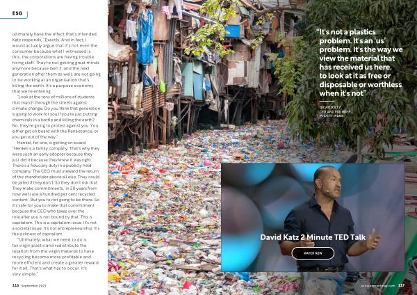 Henkel , for one , is getting on board . “ Henkel is a family company . That ' s why they were such an early adopter because they just did it because they knew it was right . There ' s a fiduciary duty in a publicly held company . The CEO must steward the return of the shareholder above all else . They could be jailed if they don ' t . So they don ' t risk that . They make commitments , ‘ in 20 years from now we ' ll use a hundred per cent recycled content ’. But you ' re not going to be there . So it ' s safe for you to make that commitment because the CEO who takes over the role after you is not bound by that . This is capitalism . This is a capitalism issue . It ' s not a societal issue . It ' s not entrepreneurship . It ' s the sickness of capitalism .