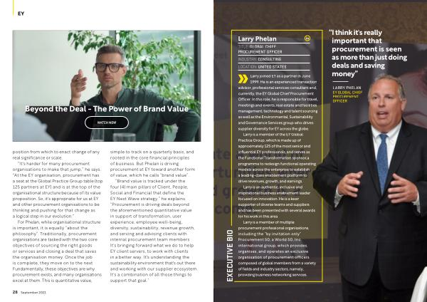 For Phelan , while organisational structure is important , it is equally “ about the philosophy ”. Traditionally , procurement organisations are tasked with the two core objectives of sourcing the right goods or services and closing a deal that saves the organisation money . Once the job is complete , they move on to the next . Fundamentally , these objectives are why procurement exists , and many organisations excel at them . This is quantitative value , simple to track on a quarterly basis , and rooted in the core financial principles of business . But Phelan is driving procurement at EY toward another form of value , which he calls “ brand value ”.