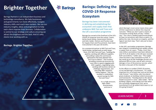 Baringa Partners is an independent business and technology consultancy . We help businesses and governments run more effectively , navigate industry shifts and reach new markets . We use our industry insights , ideas and pragmatism to help each client improve their business . Collaboration is central to our strategy and culture ensuring we attract the brightest and the best . And it ’ s why clients love working with us .
