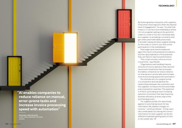 “ For supplier portals , this specifically applies to automating inputs for key information like address changes on invoices ,” continues Keulen . “ It may seem like a small detail , but having the correct information for each supplier can be the difference between getting paid on time or two weeks late .” procurementmag . com 127