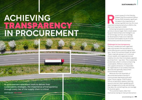 Challenges for true transparency The key is reliable and well organised data , and remains the top obstacle to more effective procurement argues Alex Saric , Smart Procurement Expert at Ivalua . “ Data is typically spread out in silos and of poor quality , and organisations lack visibility into who their immediate suppliers purchase from ,” says Saric “ This is especially problematic when it comes to improving sustainability . Without a clear picture into supplier emissions , it ’ s impossible for organisations to accurately measure , disclose and optimally reduce their environmental impact .”