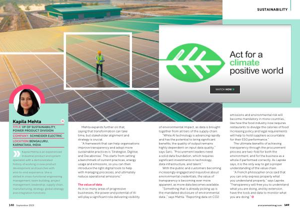“ Something that is already picking up is the mandated disclosure of environmental data .,” says Mehta . “ Reporting data on CO2 emissions and environmental risk will become mandatory in more countries , like how the food industry now requires restaurants to divulge the calories of food . Increasing policy and legal requirements will help to hold suppliers accountable for their ESG performance .”