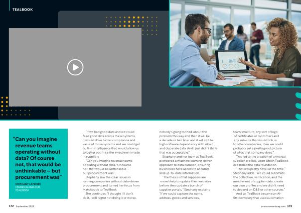 “ That was pretty novel at the time ,” Stephany adds . “ We could automate the collection , verification , and the enrichment of supplier data , create our own profiles and we didn ’ t need to depend on D & B or other sources .” And so , TealBook became an AIfirst company that used automation