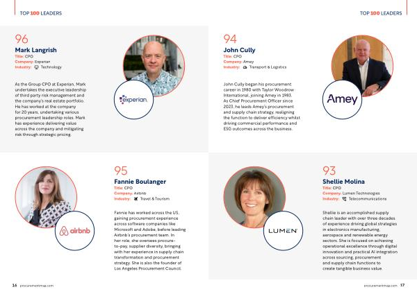 Fannie has worked across the US, gaining procurement experience across software companies like Microsoft and Adobe, before leading Airbnb’ s procurement team. In her role, she oversees procureto-pay, supplier diversity, bringing with her experience in supply chain transformation and procurement strategy. She is also the founder of Los Angeles Procurement Council.