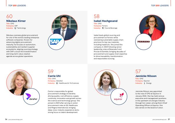 Nikolaus oversees global procurement for one of the world’ s leading enterprise software companies. Known for advancing digital procurement maturity, he focuses on automation, sustainability and resilient supplier ecosystems, aligning sourcing strategy with SAP’ s cloud-first transformation and long-term value creation agenda across global operations.