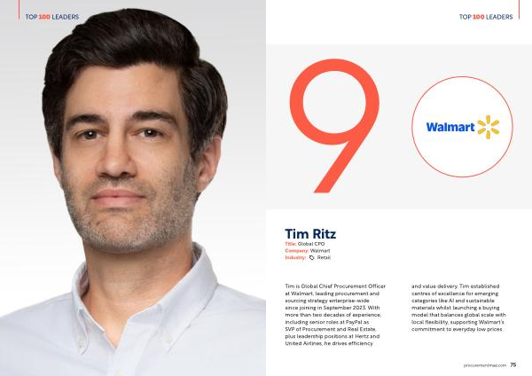 Tim is Global Chief Procurement Officer at Walmart, leading procurement and sourcing strategy enterprise-wide since joining in September 2023. With more than two decades of experience, including senior roles at PayPal as SVP of Procurement and Real Estate, plus leadership positions at Hertz and United Airlines, he drives efficiency and value delivery. Tim established centres of excellence for emerging categories like AI and sustainable materials whilst launching a buying model that balances global scale with local flexibility, supporting Walmart’ s commitment to everyday low prices.