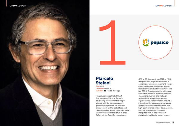 Marcelo serves as Global Chief Procurement Officer at PepsiCo, developing procurement strategies aligned with the company’ s nextgeneration objectives. He oversees procurement for the global food and beverage leader, which generated more than US $ 91bn in net revenue in 2023. Before joining PepsiCo, Marcelo was