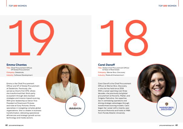 Emma is the Chief Procurement Officer and VP of Global Procurement at Databricks. Previously, she served as Intuit’ s first CPO, where she transformed their third-party ecosystem through data-backed strategies and mission-based sourcing. With prior leadership as Senior Vice President at Paramount Pictures and roles at Sony Pictures, Emma specialises in navigating complex global organisations. She is a leader in business transformation, delivering operational efficiencies and strategic growth across technology and media sectors.