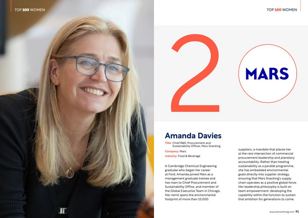 A Cambridge Chemical Engineering graduate who began her career at Ford, Amanda joined Mars as a management graduate trainee and has risen to Chief Procurement and Sustainability Office, and member of the Global Executive Team in Chicago. Her remit spans the environmental footprint of more than 15,000 suppliers, a mandate that places her at the rare intersection of commercial procurement leadership and planetary accountability. Rather than treating sustainability as a parallel programme, she has embedded environmental goals directly into supplier strategy, ensuring that Mars Snacking’ s supply chain operates as a positive global force. Her leadership philosophy is built on team empowerment: developing the capability within the function to sustain that ambition for generations to come.